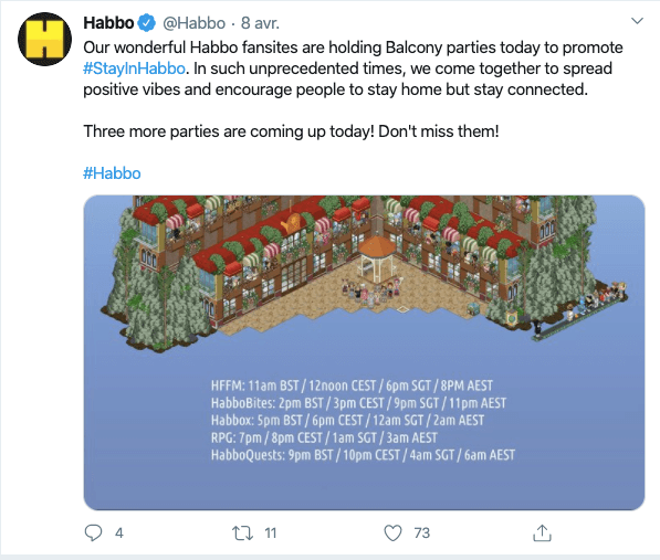 Habbo Hotel, qui connut une première vie dans les années 2000 avant de tomber dans l’oubli, a vu son trafic tripler depuis le 25 février. Connu pour son aspect “vintage”, le jeu en ligne finlandais permet, entre autres, d’organiser des “virtual parties” privées entre utilisateurs. Sans surprise, les confinés en sont friands… Même chose pour les MMOPRG Wakfu et Dofus (+100% d’utilisateurs), mais aussi pour Second Life qui, malgré son ancienneté, a enregistré une augmentation de 133% de son nombre d’inscriptions entre le 8 et le 15 mars. Plébiscité pour sa liberté de jeu, où les usagers peuvent créer et explorer comme bon leur semble, le jeu donnerait « l’impression de sortir du confinement » selon un article paru dans Le Monde. Sur Roblox, un autre jeu de création multijoueur, quelques enfants organisent même leur fête d’anniversaire…