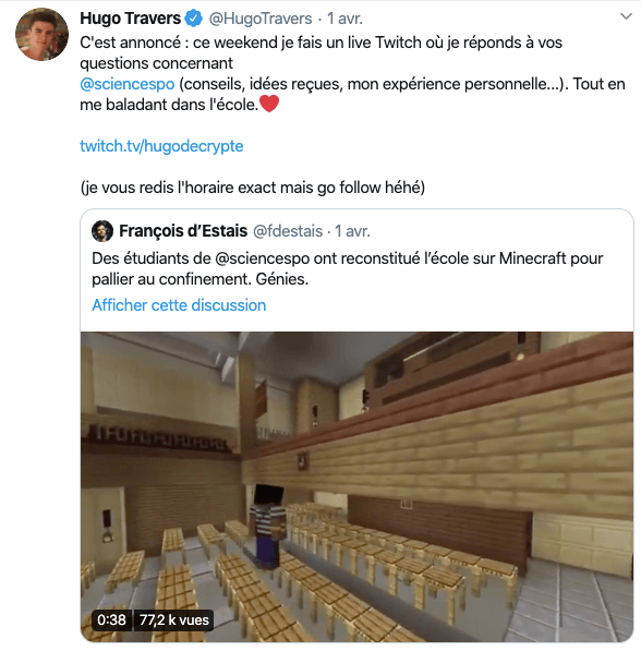 D’autres ont été plus ambitieux… Comme l’office du tourisme d’Albi qui a recréé la ville éponyme sur Minecraft, des étudiants de Sciences Po ont “cloné” leur campus dans le jeu. L’influenceur Hugo Décrypte (un ancien étudiant de l’école FIY) a visité la construction dans un live Twitch le week-end dernier où il répondait aux questions de sa communauté.